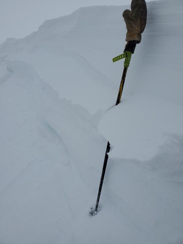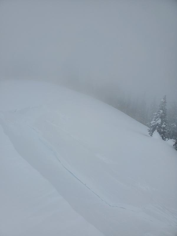 Triggered a small slide toward the top of the north ridge of Dry Canyon. We noticed a lot of wind loading on a small, low consequence slope, so I decided to see if I could get it to slide. It took 2 stomps and it broke about 75 feet wide, 18" thick, and slid maybe 30 or 40 feet.