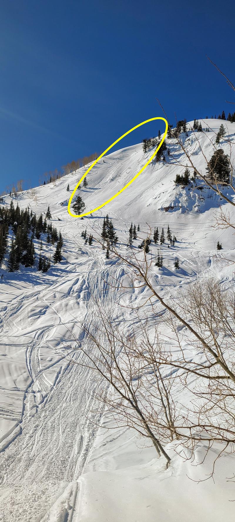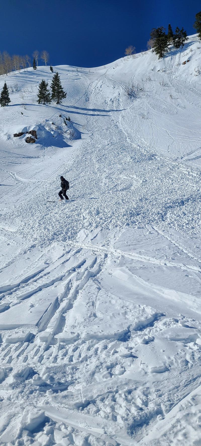 Rode our snowmobile on a really nicely groomed road in the Wasatch Mountain State Park from the Mill Flat Trailhead. Skinned and booted toward Ant Knolls. Only a couple turns into skiing a line, I triggered a small wet loose while dropping an east facing 40 to 45 degree slope. The slide started very slow and small but picked up speed and width. I was able to stay to the side of the slide. Not risk of burial but may have been knocked me off my feet if I did not have the space to move to the side.