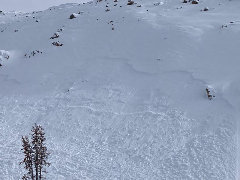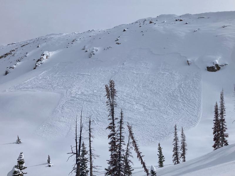 Strong south winds deposit mid week storm snow lower downslope than you'd expect. This naturally triggered wind drift isn't particularly big by Uinta standards, but enough moving snow to keep ya on yer toes.