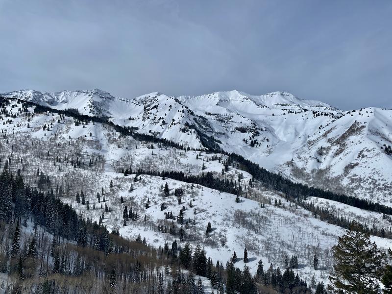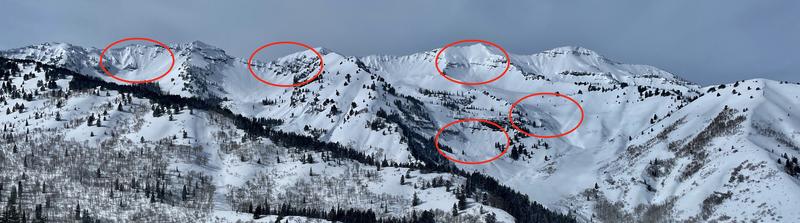 A series of avalanches on south-southeast facing Cascade Ridge. Most likely naturally occurring during the storm February 21-23. Some areas we could pick out crown lines and other places we could see evidence of debris in the lower bowls.