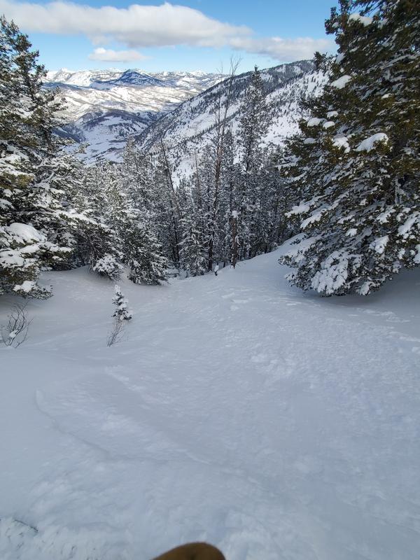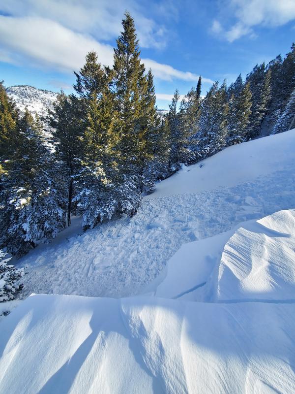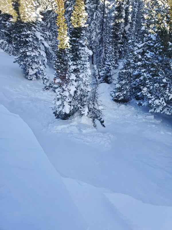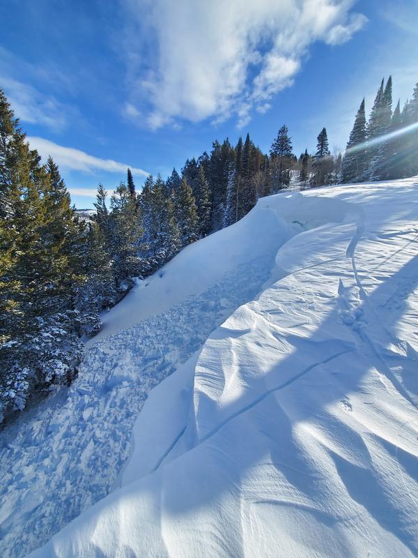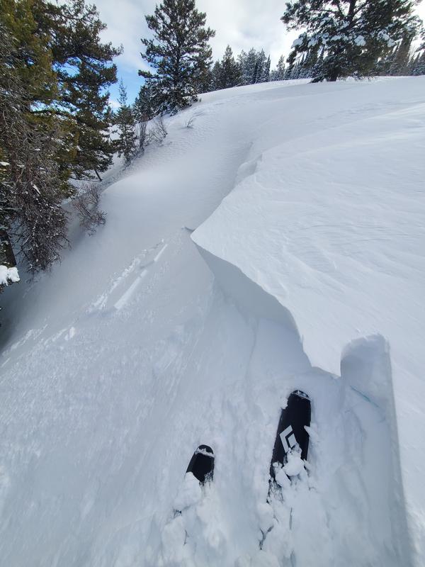 We observed a lot of sensitive cornices and wind slabs today on northern and northwestern ridlines around 8500 feet. The first cornice fall/small avalanche was triggered from a distance while walking on the ridge. Others were triggered from a distance while jumping on the ridge (see video). A ways farther up the ridge we got a few small soft wind slabs to break off at our feet, and these ran 100-200 feet into the trees.