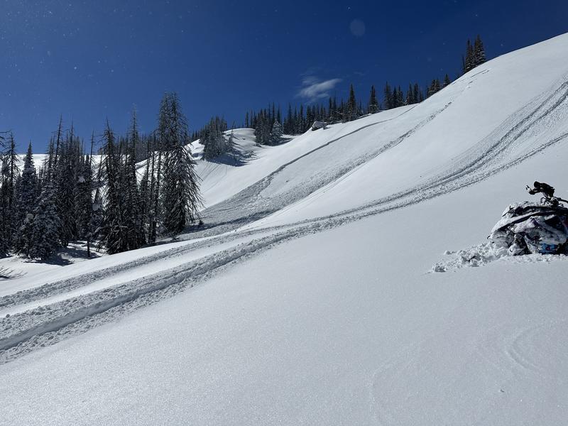 Slide triggered from approximately 30' away. Notice the hairline fracture at the top extending over towards the snowmobile tracks.
