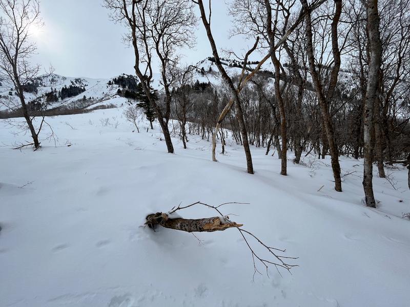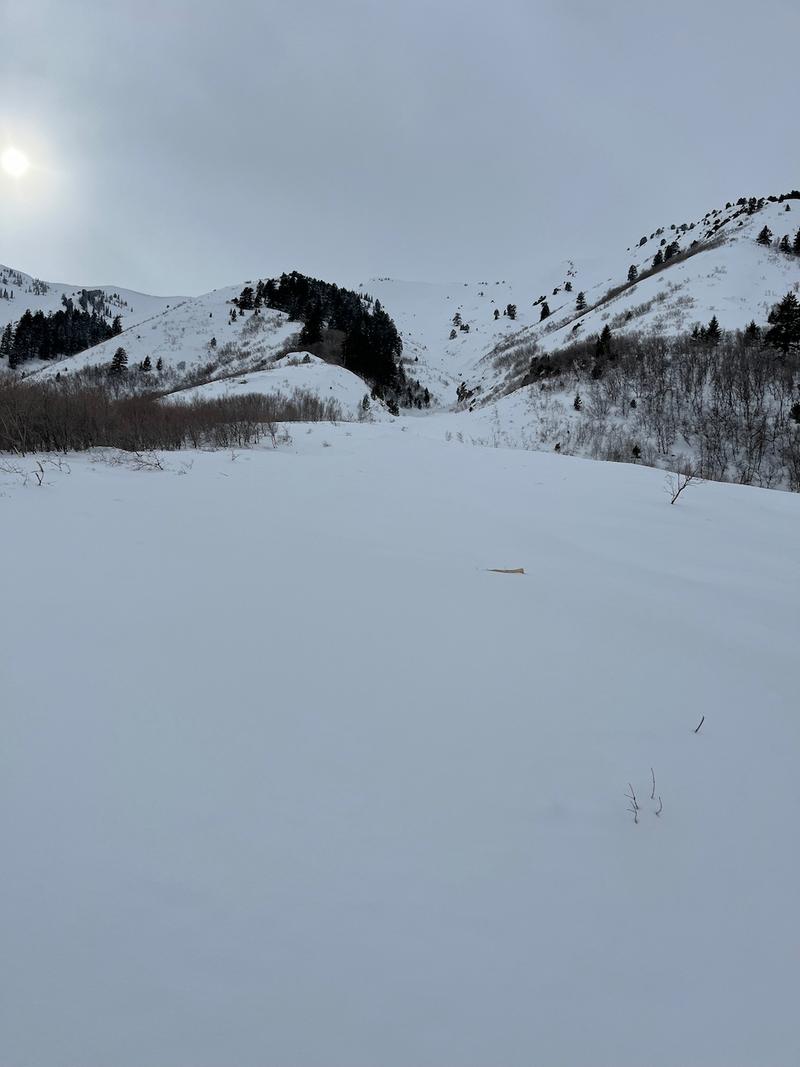 I went up to Maple Bench to check out the extensive natural avalanche cycle that occurred earlier in the week. The avalanche in Bird Canyon was one of several large and very long running natural avalanches that probably all ran around the same time during the intense part of the storm on Monday morning. The avalanche ran fun length of it's path and pasted the maple trees well down in the forest below the path.