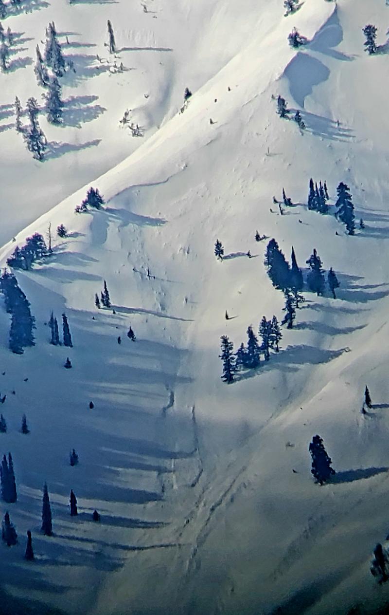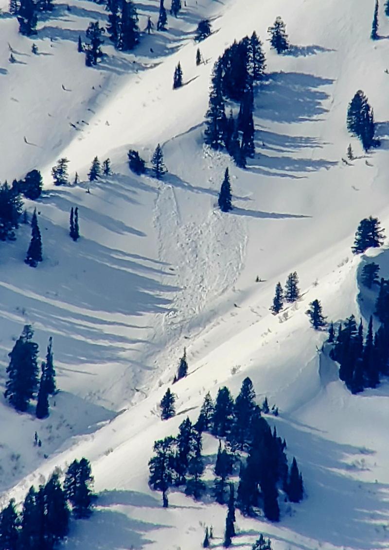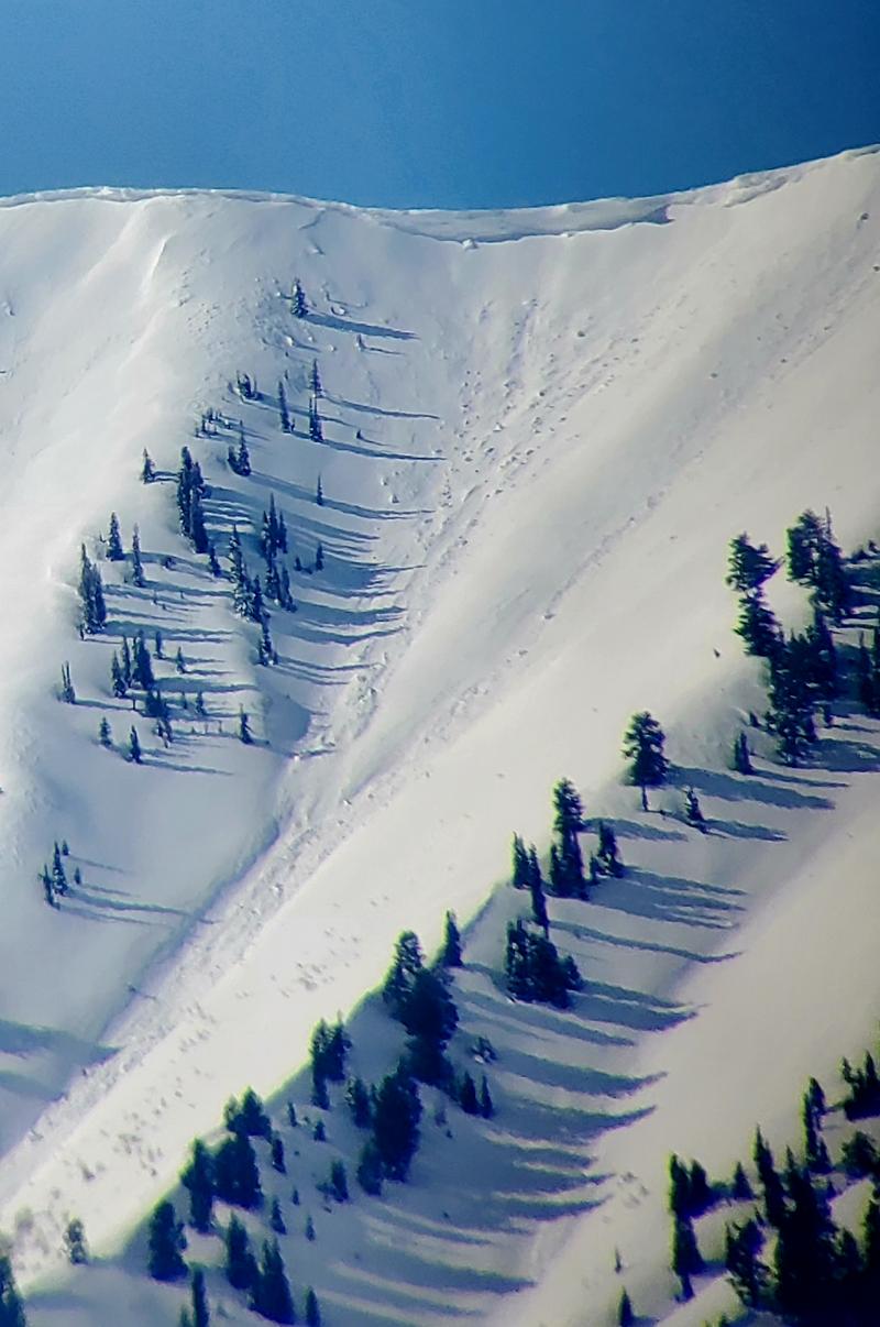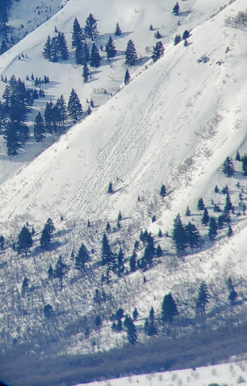 We got a good look at the Wellsvilles this morning an noticed a fair amount of avalanche activity. Many canyons had cornice fall avalanches at the head (see Pic one in Old Logway canyon). Some appeared to be several hundred feet wide and ran 1000 to 1500 vertical. Mid elevation ssabs were observed in several canyons. They looked to be around a foot deep and 50 to 100 feet wide runnign 300 to 600 vertical (see pictures 2 and 3). And at the lower elevations many rollerballs and runnels were observed (pic 4). The snow coverage looks amazing, looking forward to some springtime ascents.