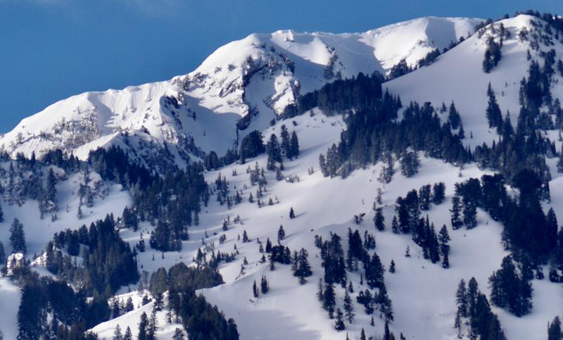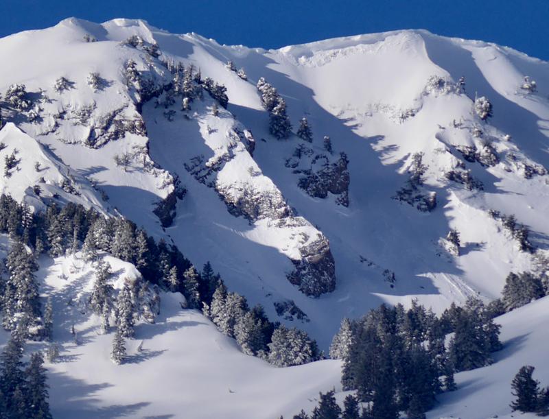 Evidence of widespread natural avalanches was apparent this morning, including several broad slab avalanches, 1-3' deep and several hundred feet wide. This one on Box Elder Peak was fairly impressive.