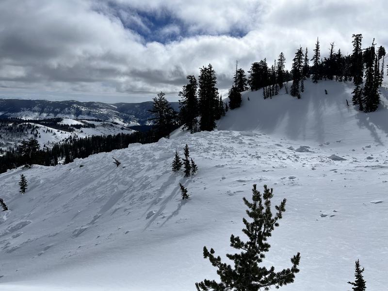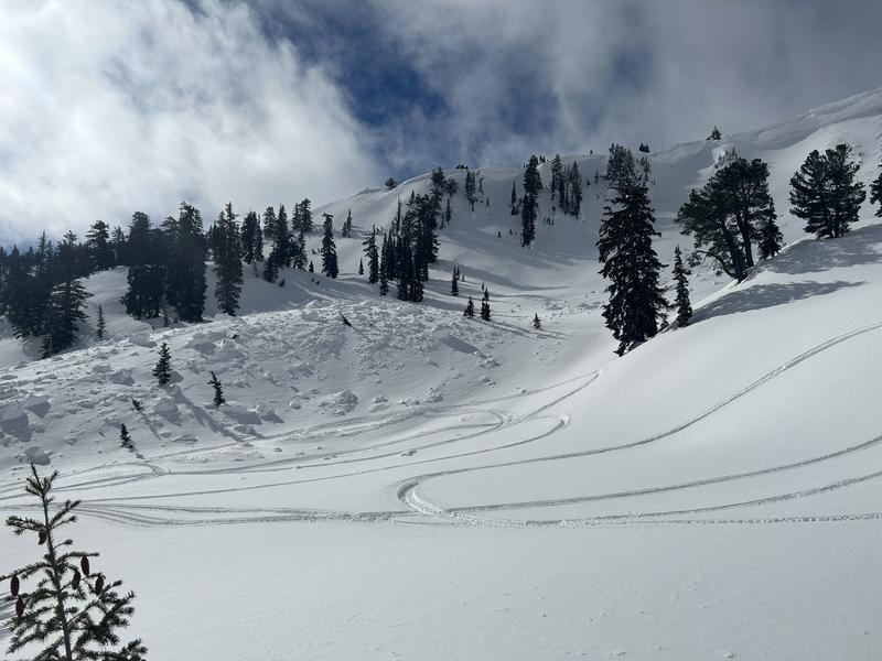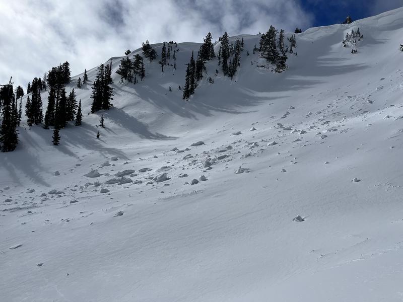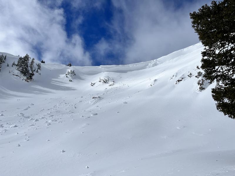 We came across this very large Cornice Fall in the Tony Grove area on Saturday March 11. We guess the cornice broke sometime during yesterdays warm up/rain. This was a massive break with the cornice being 40' tall. It ran a couple thousand feet. Probably the largest cornice fall I've seen in 20+ years riding the area.