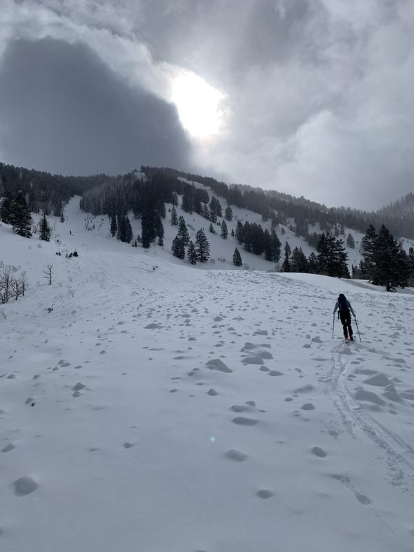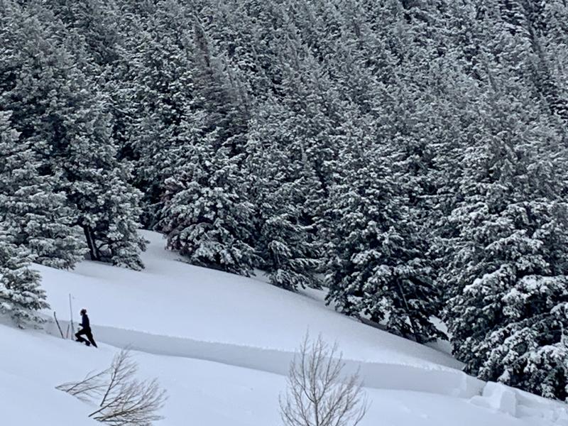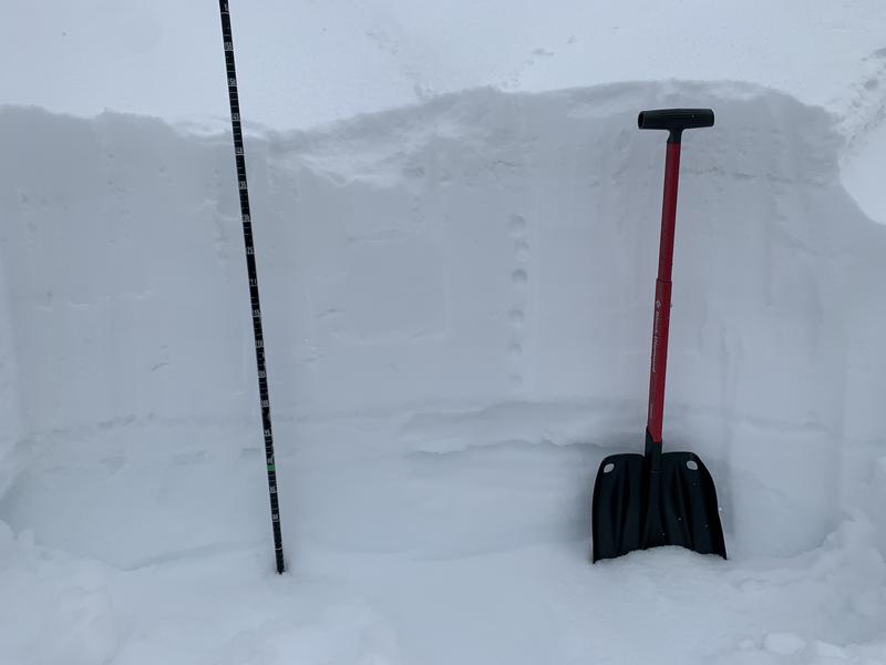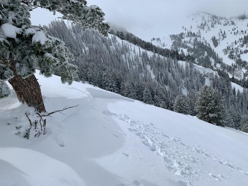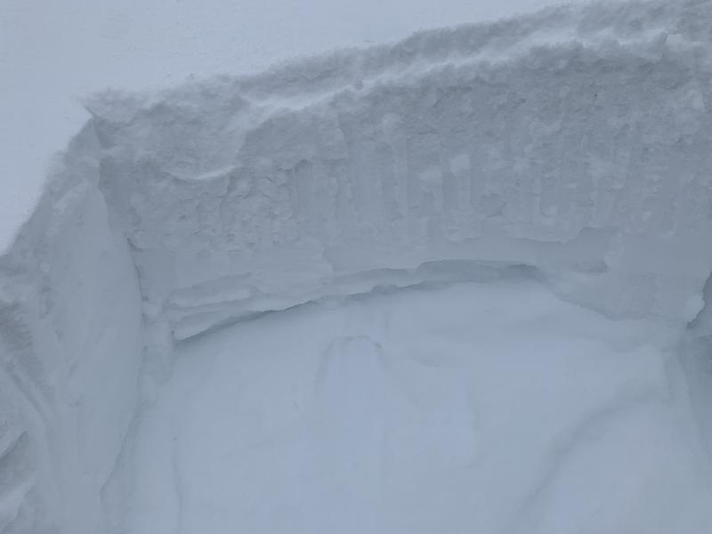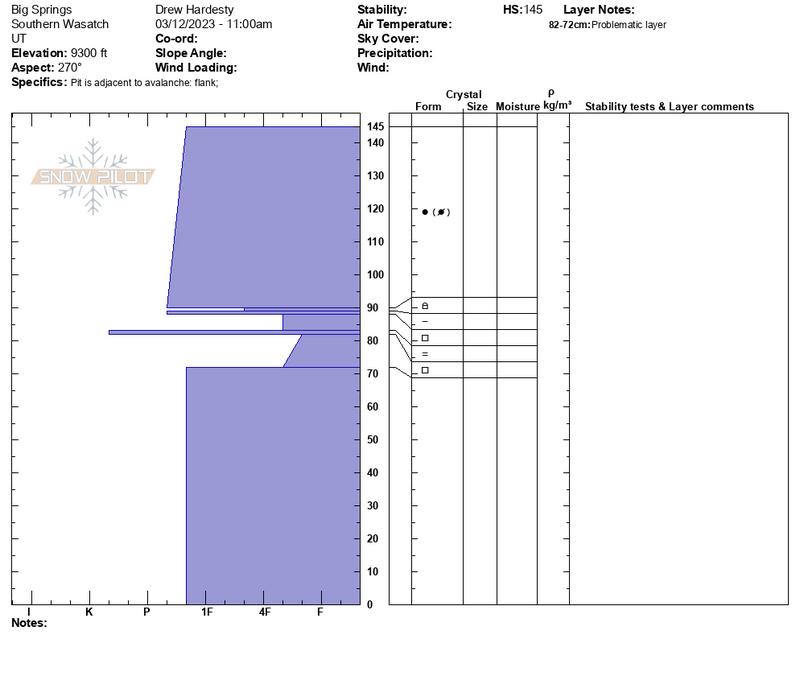 Forecaster Drew Hardesty and ski partner Zack Little went to investigate this very close call of an avalanche. This avalanche failed on a thick (~20cm) weak faceted snow below some crustst in a thinner snowpack area on a very steep west facing slope. This structure has not been noted as representative of most of the terrain in Provo and yet exposed, wind stripped west facing slopes can pose problems, particularly when subsequently wind loaded. The total depth of the snowpack at this location was only 55-65" (at 9300') whereas we have weather stations at 8250' and 8800' with 125" and 144" snow depths in Provo.