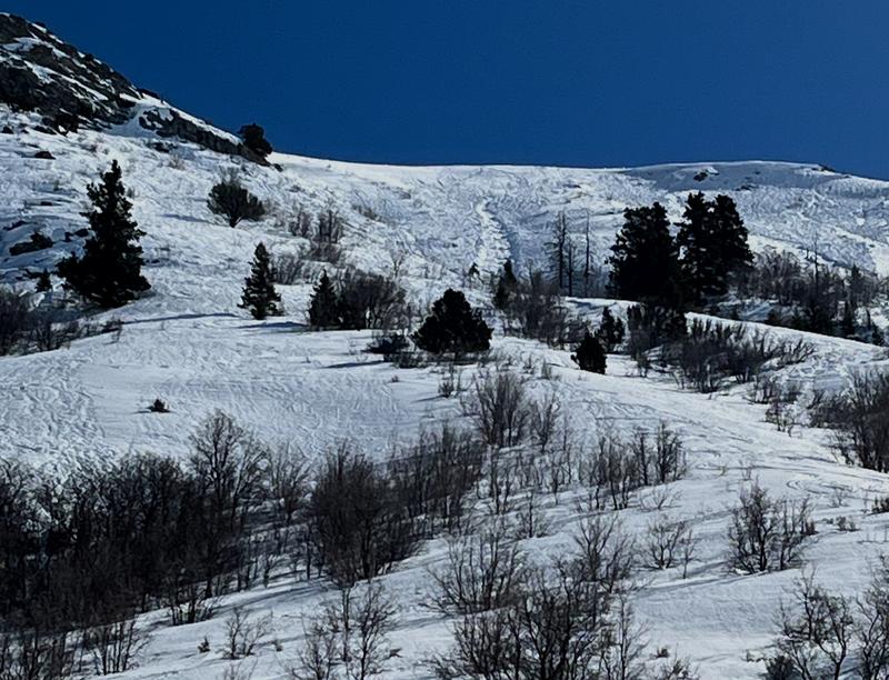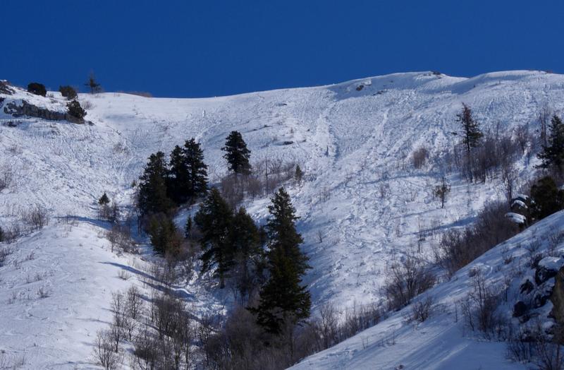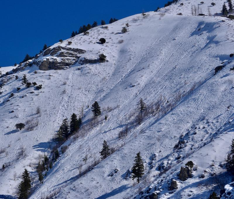 Several natural wet loose avalanches and lots of goo goo balls ran down the steep low elevation slope above the entrance to Green Canyon. I think these occurred on Friday afternoon during the very rainy and windy storm.