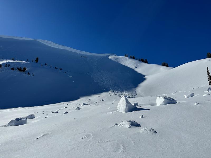 Evidence of this large recent natural cornice fall avalanche was observed and photographed in Three Terraces Bowl on Saturday.