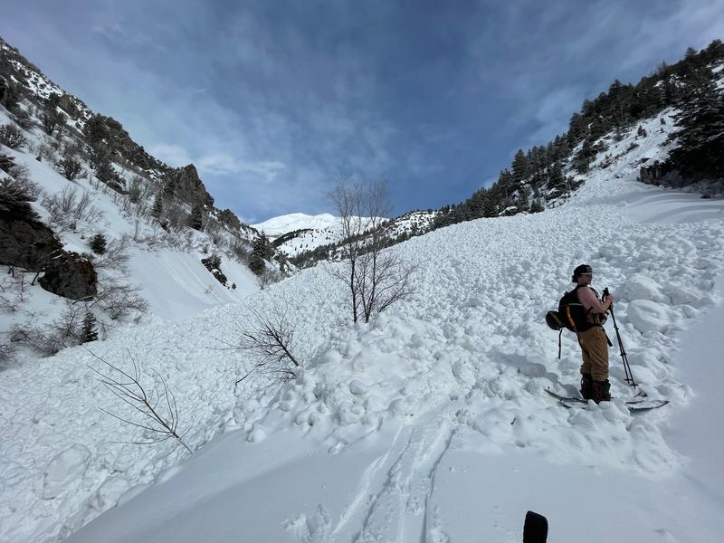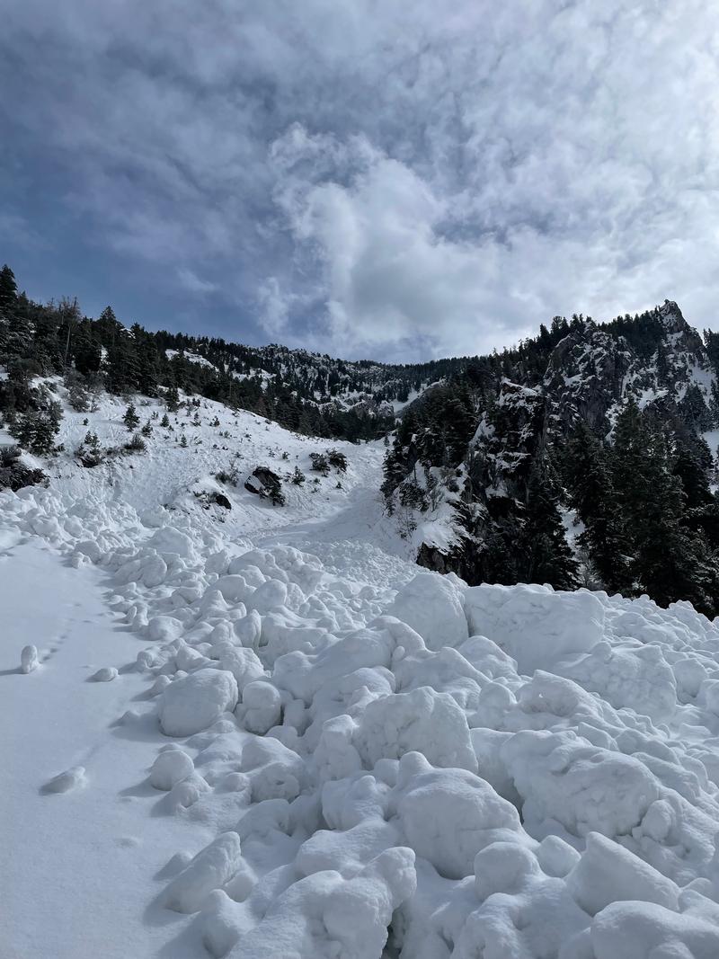We skinned up Slate Canyon on the afternoon of March 11. We were wary of this particular avalanche path given the recent rain, warming, and likely windloading off the top of Buckley. The debris deposit both from the most recent and previous avalanches was impressive. The debris pile was about 300 feet in length and looked to be 20+ feet deep in spots (hard to capture with pictures). It has completely wiped out the trail. The most recent debris ran full track down into the stream bed and some oven-size chunks of snow were visible. There was about an inch of snow over the debris, indicating that it avalanched the night of March 10 or early in the morning March 11, sometime before the snow subsided.