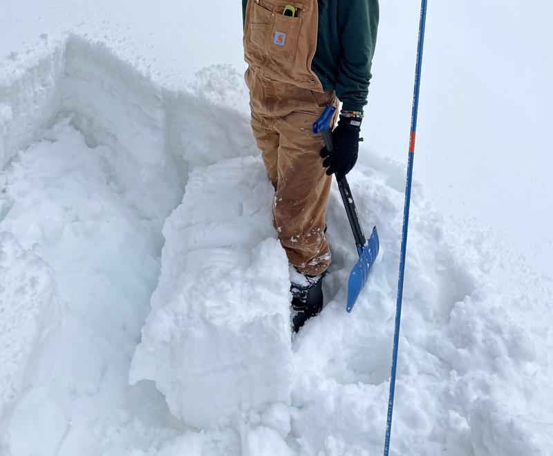 Further up-canyon, we dug a hasty pit at 7100' on an east-northeast facing slope. We found 1.5 meters of total snowpack. The top 20 or so inches of snow formed a thick, heavy cohesive slab and sat on loose, wet grains (maybe old facets that got soaked with the rain?). These grains were so loose that some would spill out as soon as we exposed them in the pit, and the cohesive slab on top was obvious while digging and with finger tests. Seems possible that the large debris pile we saw was the result of an avalanche that failed on this layer. Hard to say for sure. Upon seeing how cohesive the top slab of snow was and what it sat on, we proceeded carefully down the ridge we ascended.