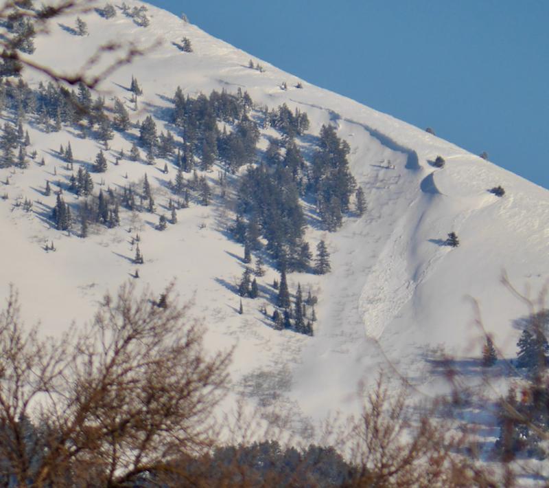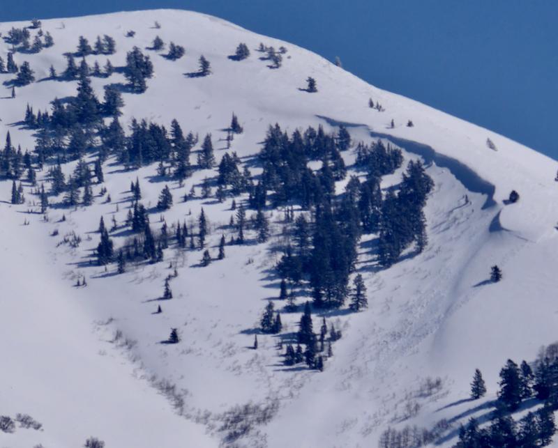 A recent natural avalanche of wind drifted snow visible from across Cache Valley. The avalanche likely occurred during the day on 3/15/23 due to drifting from southerly winds.