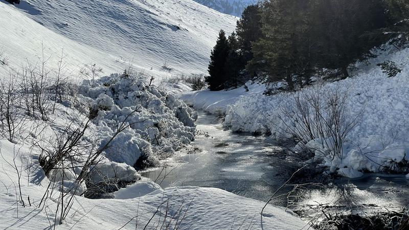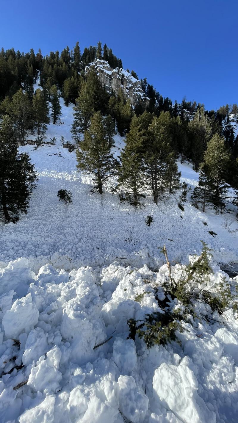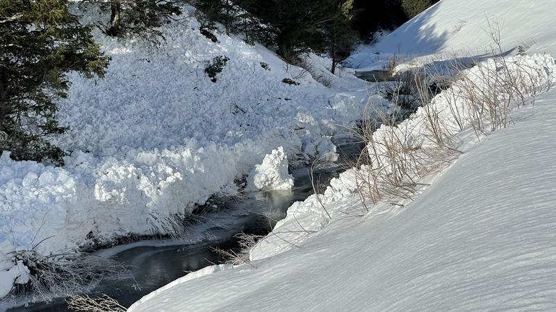 Snow and debris deposited into the creek and next to Temple Fork road.