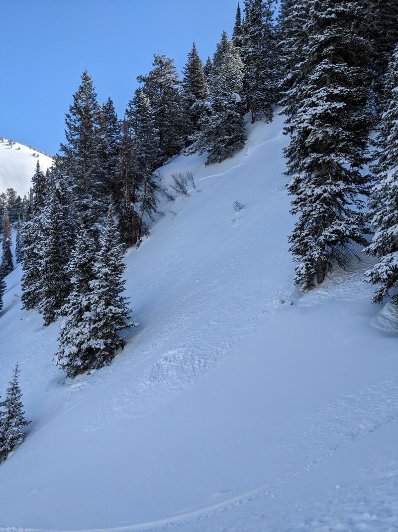 Saw numerous very shallow surface snow avalanches in dry today. All on ~N facing slopes. Crowns were mostly only a few inches deep, maybe up to 6" or so. Some did propagate quite far, maybe as much as 100'. While skinning (on N facing slopes) we didn't really encounter any cracking other obvious red flags.