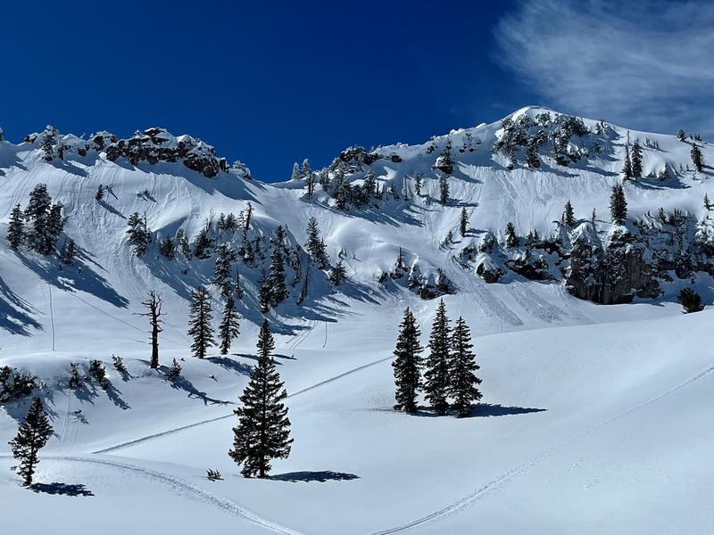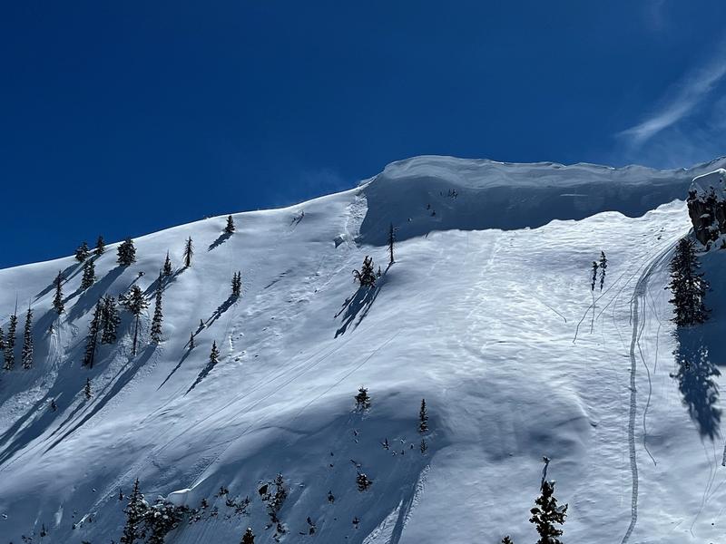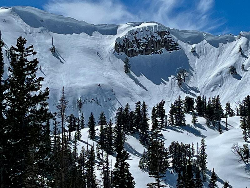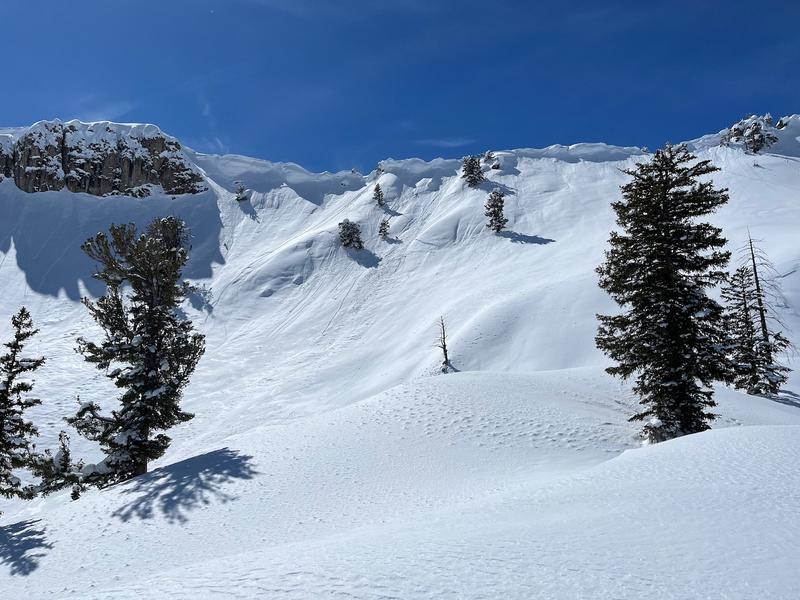We observed evidence of numerous natural avalanches above Tony Grove Lake that had occurred during the recent storm, most likely on Friday night (3-24/3-25). There were a few more recent slides, cornice falls and loose avalanches of strom snow. Here are some pictures of Castle Rock and Naomi Peak that show the activity...