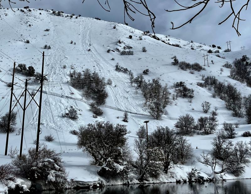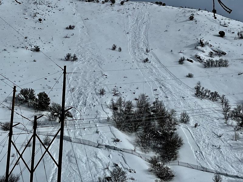 On our way down Logan Canyon this afternoon, we observed numerous small loose avalanches of moist fresh snow on steep slopes in the lower part of the Canyon. When we got down to the bottom, we could see a couple more above First Dam. These ran pretty far, but when they happened when the snow was powder, so they were fairly harmless. As temperatures warm we expect loose wet avalanches that will entrain heavier and deeper piles on the same very steep low elevation slopes.