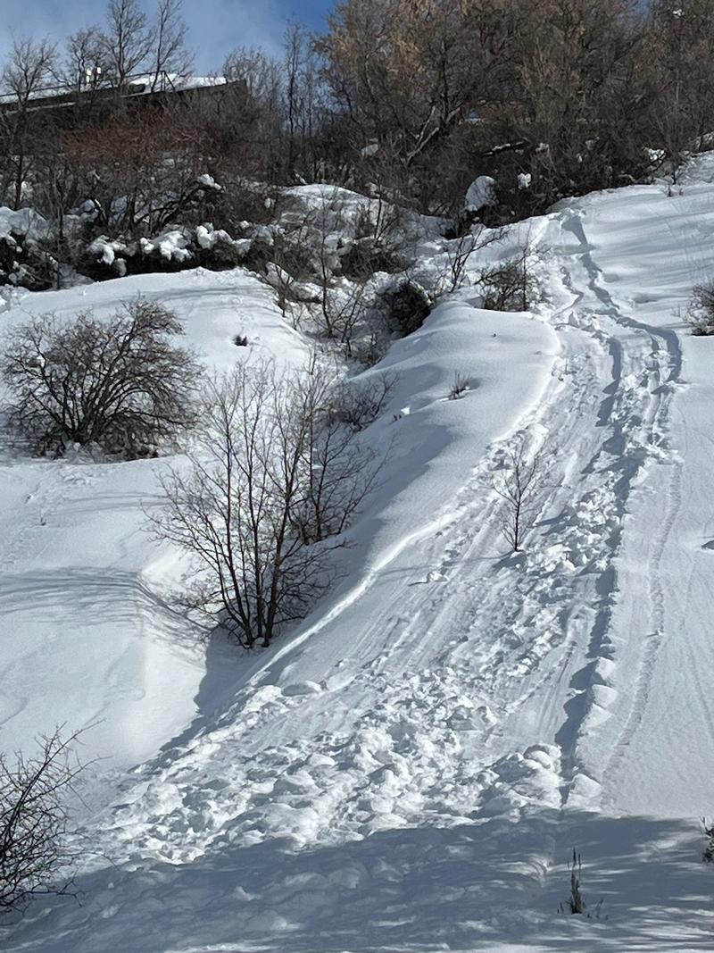 A small natural wet avalanche started just below homes at about 4800' in elevation and ran down to the back of the Water Lab. More natural or human triggered avalanches will be likely on this and other similar steep snow covered slopes as temperatures rise this weekend.
