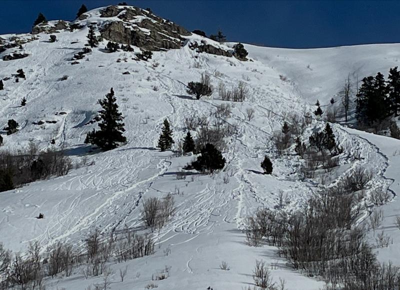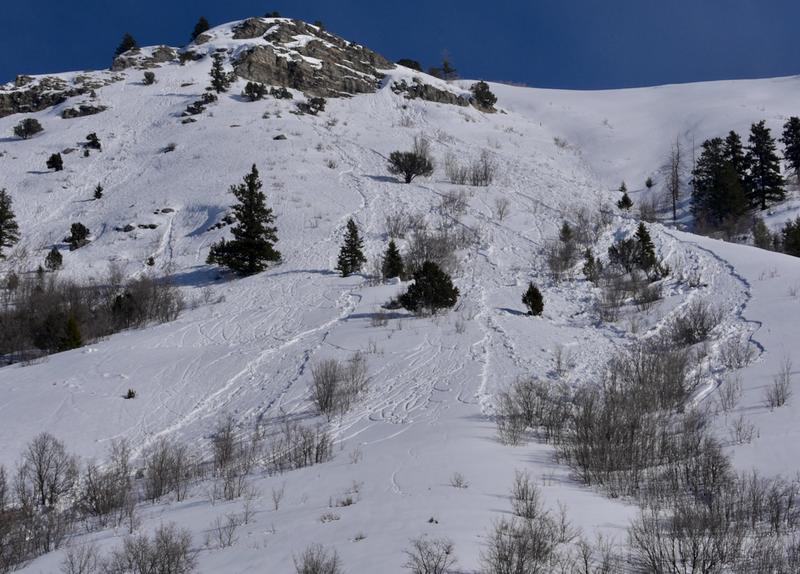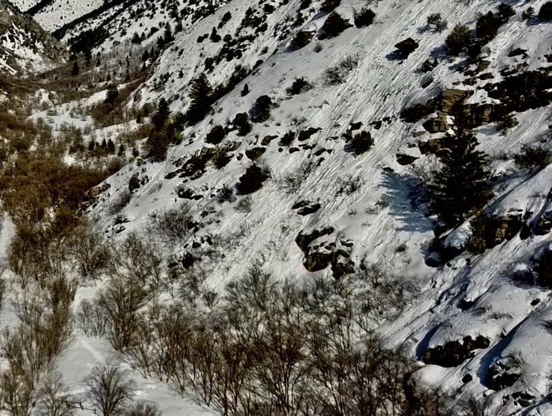 Numerous natural wet avalanches ran off the walls on southern side of lower Green Canyon late yesterday afternoon, a few making it down to the canyon floor.. I noticed several fresh wet loose avalanches above the access road and TH, and I could see a couple more up the canyon a little ways...