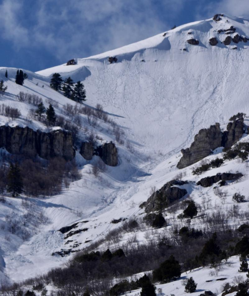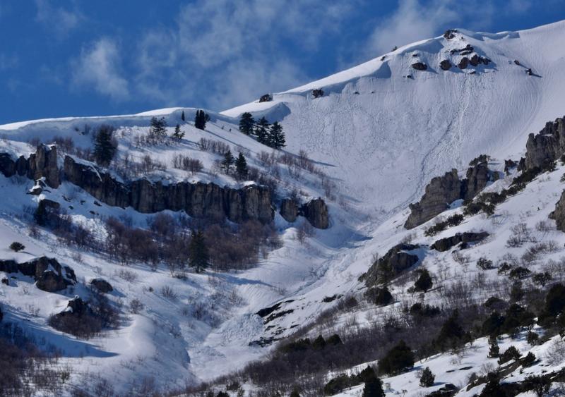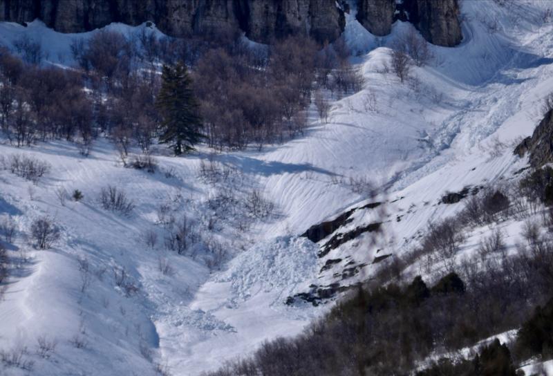 A large natural wet loose avalanche occurred recently in south--->southeast facing terrain in Powder Hollow. As seen from Logan Canyon just up the road from FS Card Guard Station
