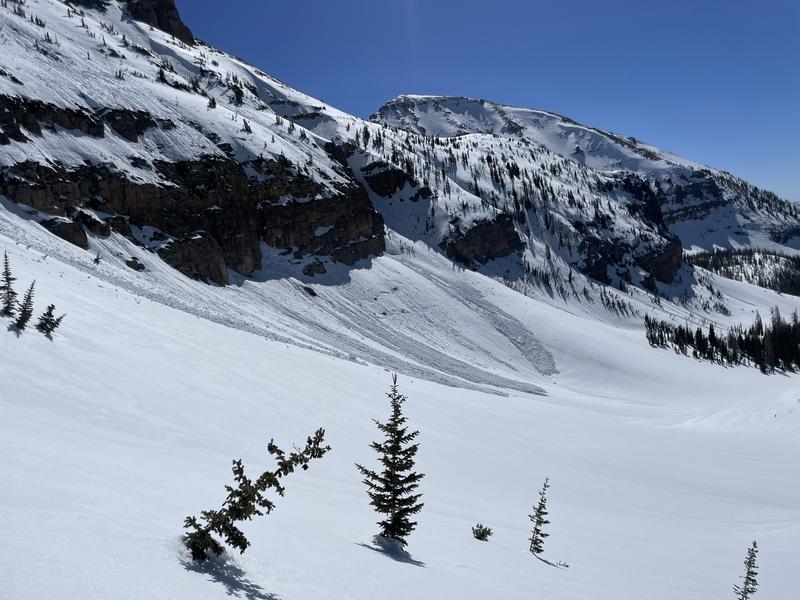 Lots of wet activity was observed in the high elevations in the Uintas on the south and southwest aspects. Lots of the slides (like in the photo) were snow coming off the steep rock faces. Slides like in the attached were evident across the range we traveled through.