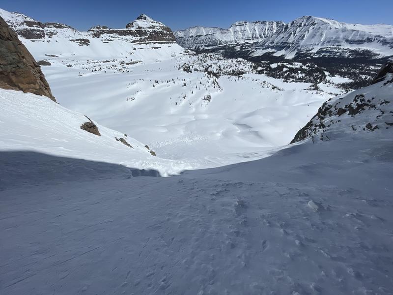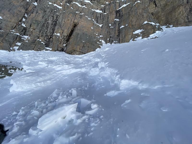 The avalanche forecast has been warning of large and sensitive cornices for several day. This large avalanche was triggered from a cornice naturally shearing off 200'+ above at the top of the cliff band. The bed surface had the small amount of snow from Thursday's storm so this slide most likely occurred on Tuesday or Wednesday (April 11 or 12). The avalanche ran to the flat below and had chest freezer-size debris chunks.