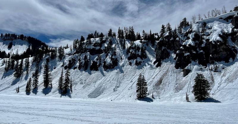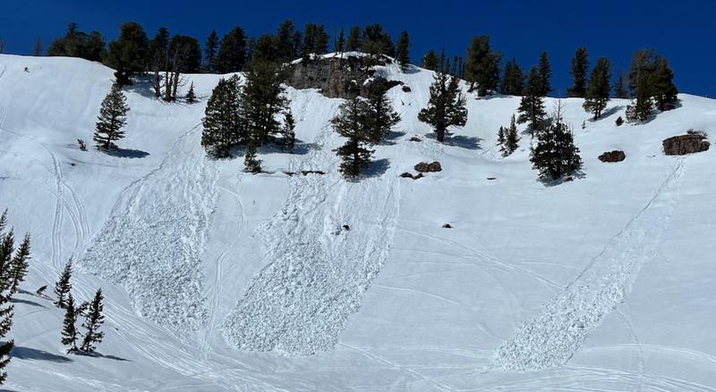 We encountered evidence of dozens of recent natural wet avalanches in steep terrain under cliffs and cornices from last week's heat.