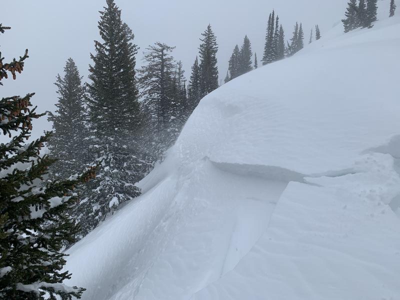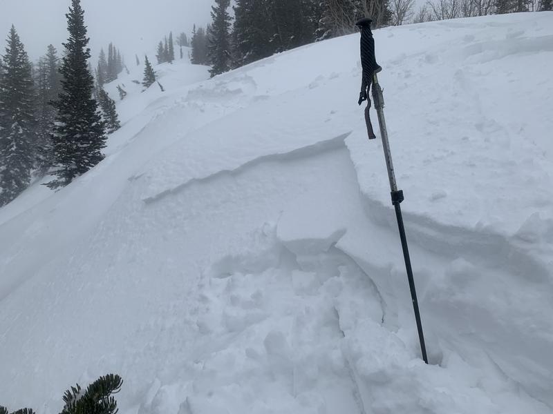 This was an intentional trigger from a ski cut off the ridge just north of Steam Mill Peak. Crown depth varied from 1 to 6". The new dense snow was not bonding well - lots of cracking and easy shears along the uptrack. Quite a bit of wind out there today, even in sheltered areas. Some graupel. Skiing was fairly 'meh' thanks to the inverted and slabby conditions.