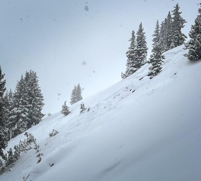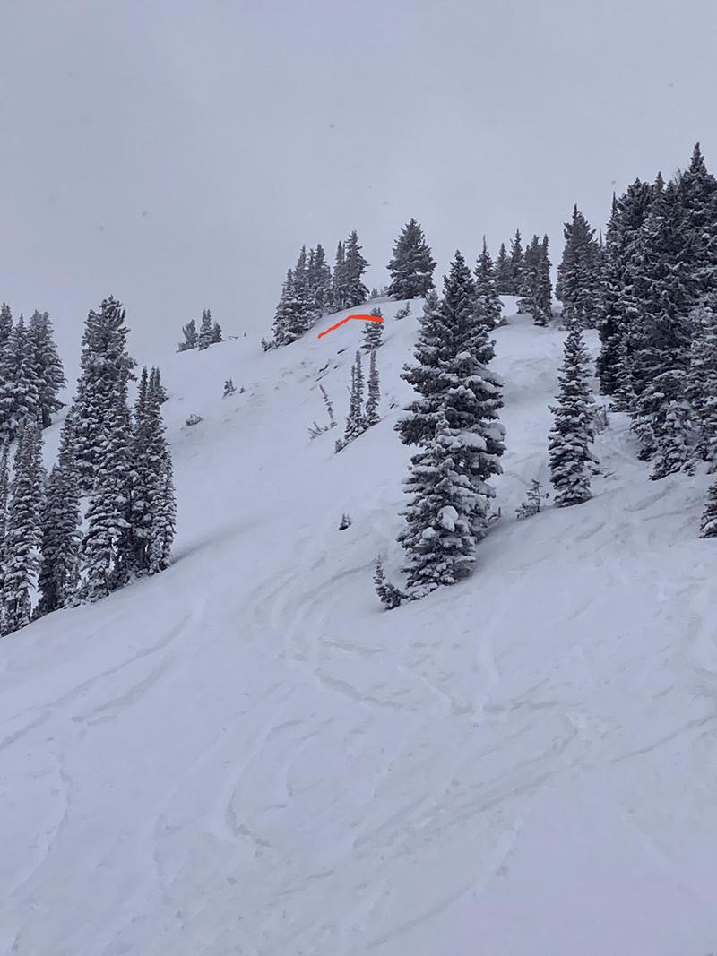 Skied down the ridge line heading west down toward the top of Guardsman. Making sure that no one was below me I cut a little lower. The new snow layer gave away exposing some gnarly rocks.