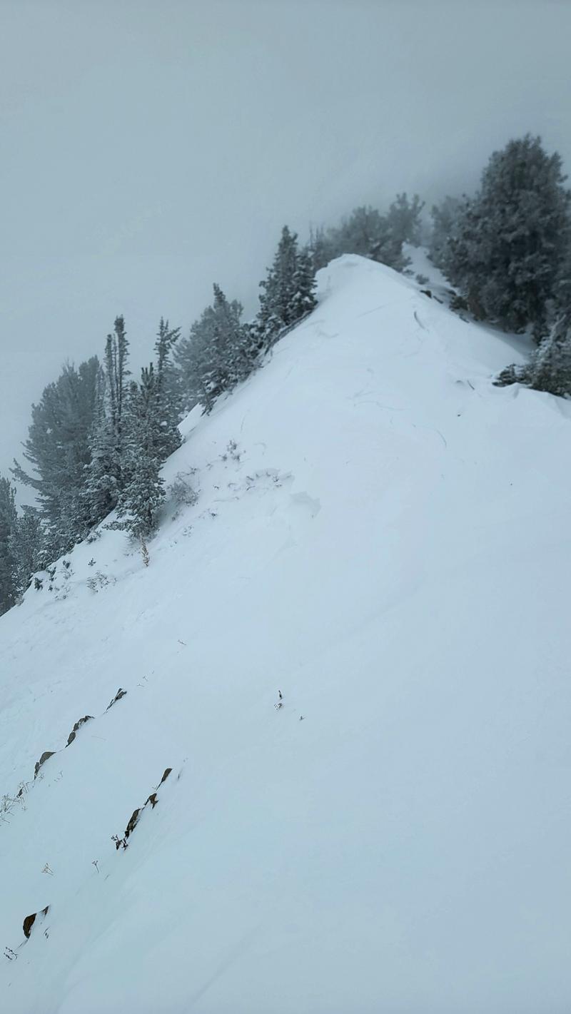The second chute remote triggered from 50', shooting up the slope, thru the wind slab, and and breaking most of the path, sliding down to bed surface about 400'. The crown varied from 12"-24"