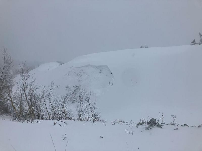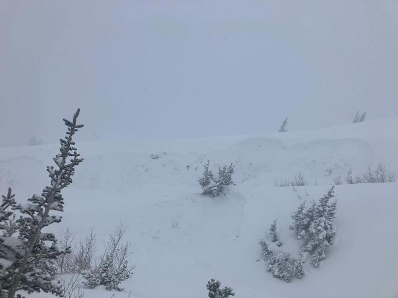 Skinned up the Flagstaff ridge and noticed obvious signs of wind loading over the ridge including shooting cracks, whoomph noises, and wind drifted snow. Skied down the Flagstaff face and a skier unintentionally traveled too far skiers right towards the ridge near the start of the flagstaff gully. This triggered a wind slab to break loose from loaded snow over the edge of the gully. 300 ft wide, 10 ft long, d2. The entire slope broke with the slide. The skier was carried for 3 ft before stopping and not fully buried.