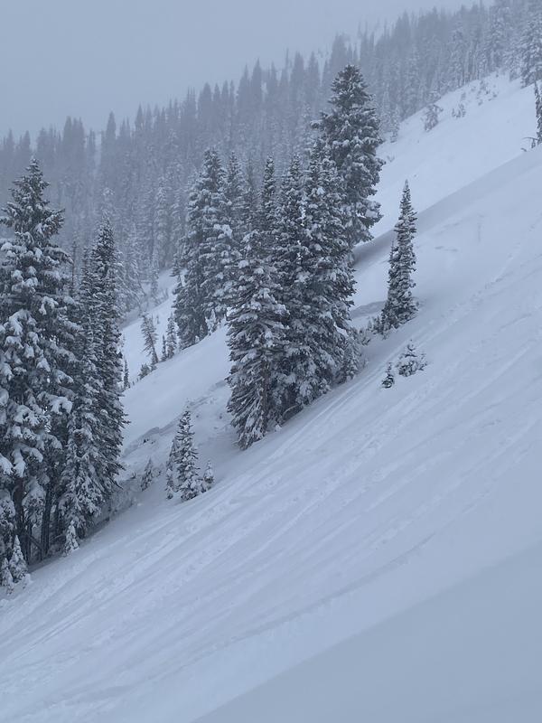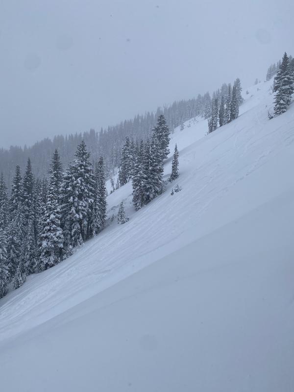 Tracks were observed all around but did not see any running into the slide path. Possibly remote triggered by one of the people that skied by on the lookers right. Looks to have ran about 150' into the trees but was hard to tell from the ridgeline.