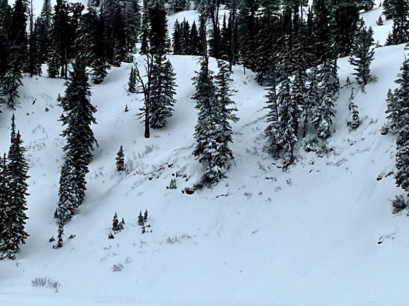 I could see evidence of a few recent avalanches of the west side of the lake, which were not reported yesterday. They may have naturally avalanched yesterday evening or overnight, and there was a little new snow on the debris.