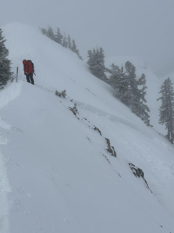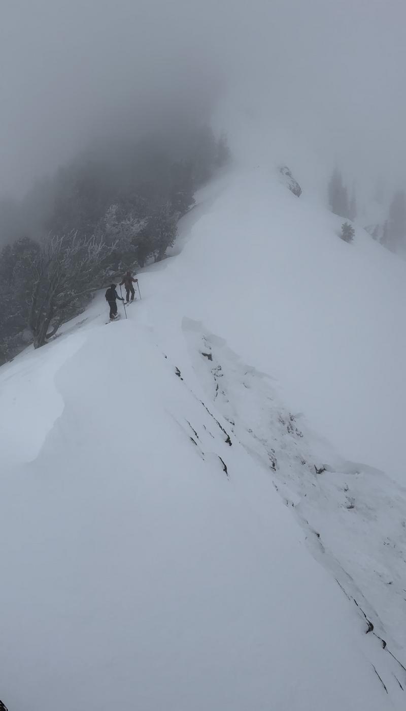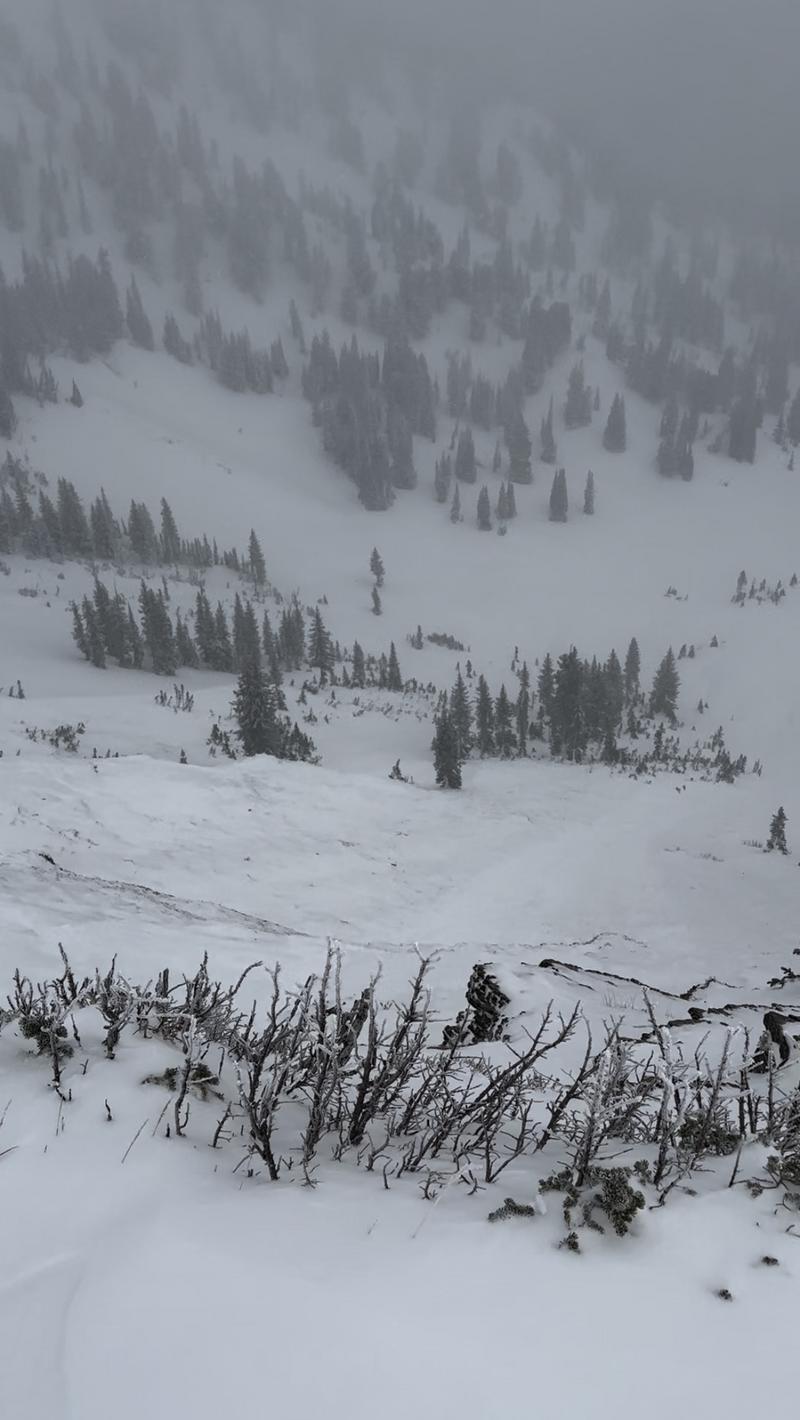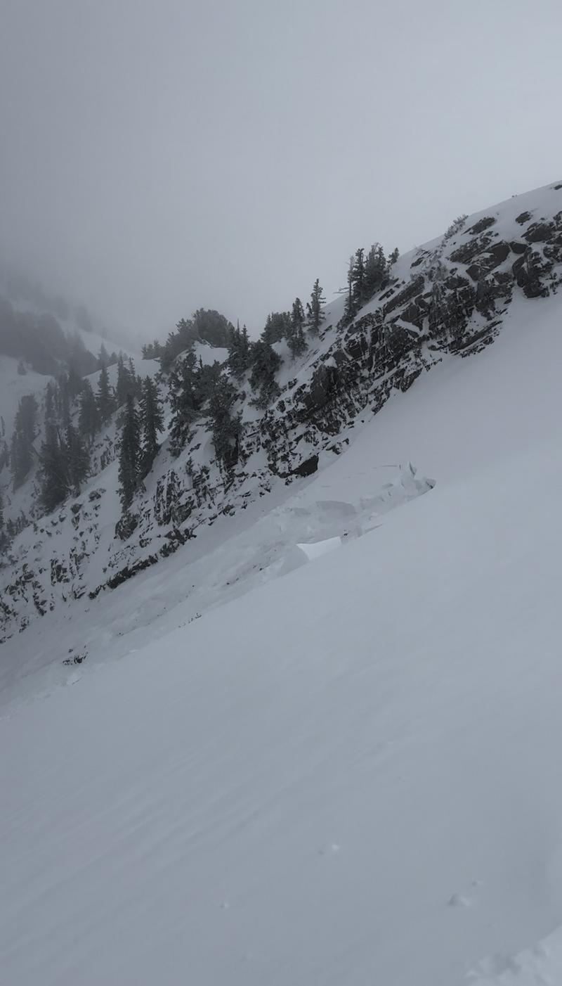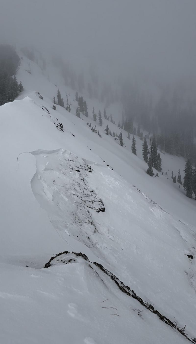 As we walked the upper days ridge from two dogs to true flagstaff, I noticed a big crack appear underfoot. Looked back towards two dogs and saw the entire slope folding on itself about 50' down and sliding. It propagated big, ripping out the shot skiers left two dogs and extending far into the North facing terrain. Intially we thought it propagated all the way to Jaws, but as we got in the basin later we noticed it only went to the skiers left shot of oingo boingo, propagating approx 600' wide. Crown was varying in size and we couldn't get close to it safely, but it was appeared to be 3-4' in spots. It slid to bed surface and ripped thru the flats where everyone transitions below. Still plenty of hangfire sitting atop two dogs that didn't release.