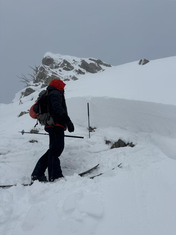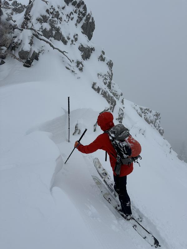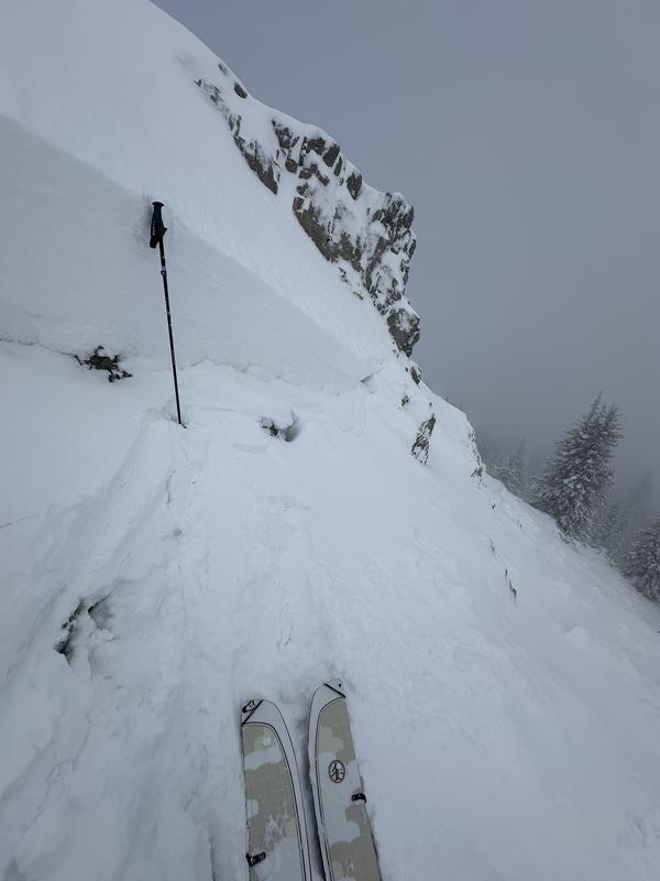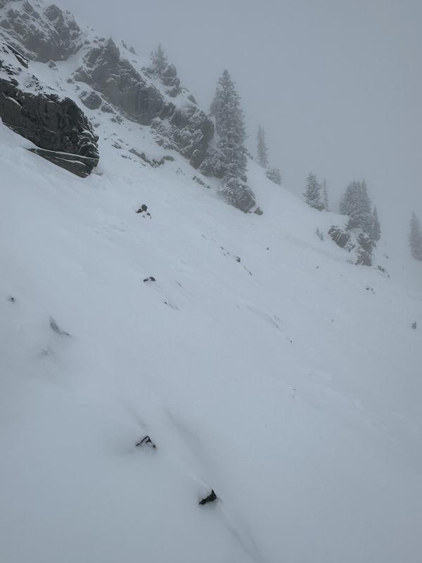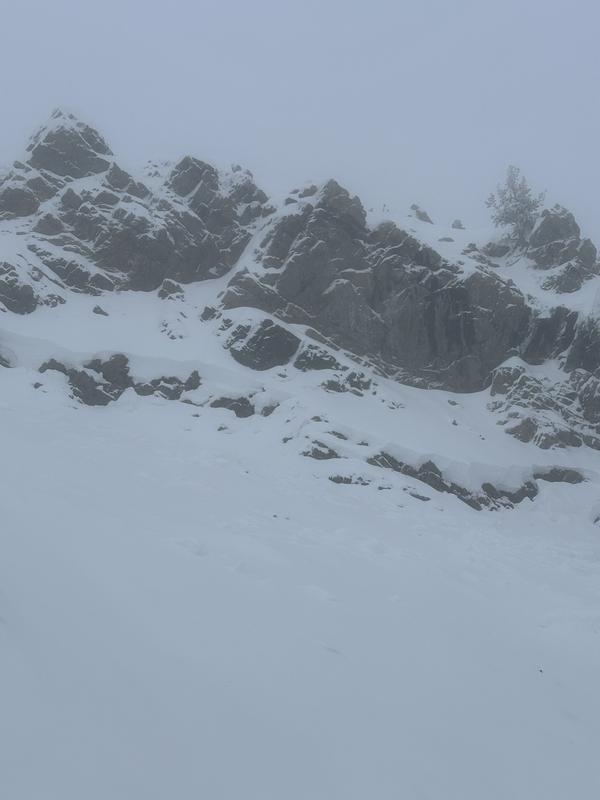 Walking towards true Flagstaff we noticed a crown just to the north of the peak. Remaining hang fire was minimal so we traced the crown for about 400' before finding the edge of the slide. It slid to the ground as well, crown varying in size, but as big as 4' in spots. Looked to run near the end of the storm cycle naturally, as there was a few inches of snow on bed surface. We rode bed surface/rocks/debris into the basin and exited days via BCC.