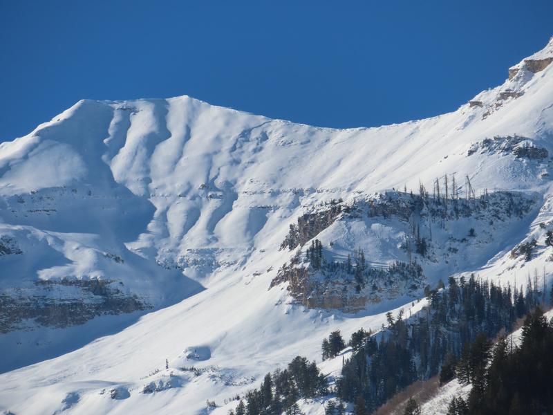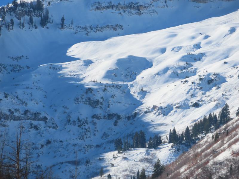 Debris ran onto upper bench then remote triggered several of the terrain features below bench. South Summit area avalanched earlier in the storm and was filled back in, while the main bowl below the saddle avalanched later in the storm.