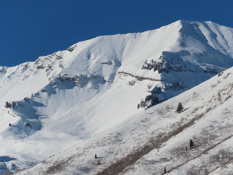 Avalanche occurred earlier in storm. Debris did not run past upper bench.