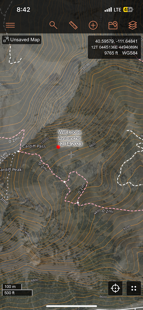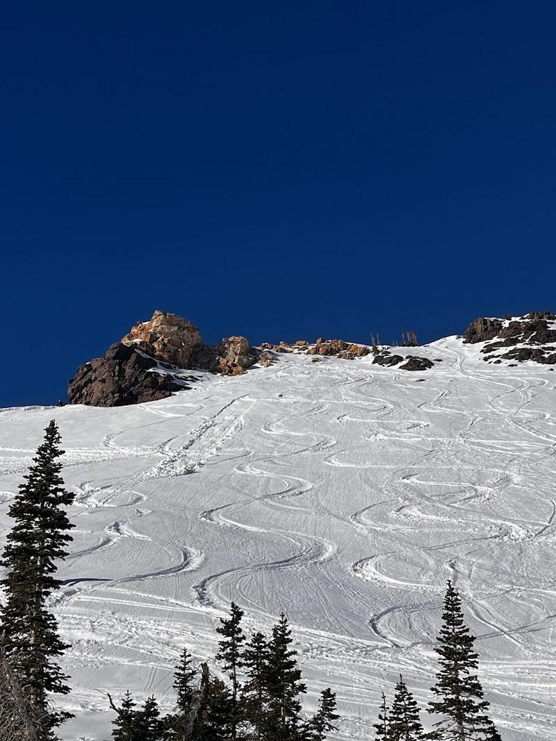 Wet loose avalanche, skier triggered, unintentional, R1, D1. In the Cardiff pass run area, 9900 ft., south facing, 12-14-2023, around 14:00 PM, approximately a 30 - 32 degree slope. The weather on this day was clear skies, strong sun exposure, and warmer than usual temps.