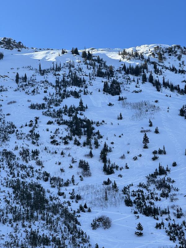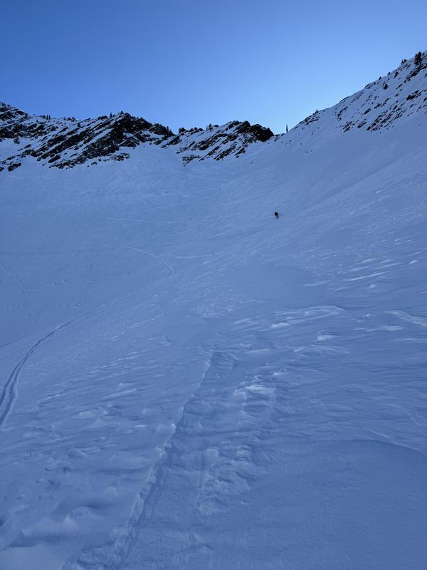 Saw several sluffs on steep NE facing slopes as we went back towards room of doom, too far away to evaluate. Do not know the timing but they looked recent and I don't think have been reported. Room of Doom was absolutely wind scoured from apron up. We transitioned at the mine and skied an assortment of not very fun surfaces. Several wet releases off the rocks on the west facing aspect.