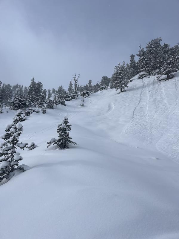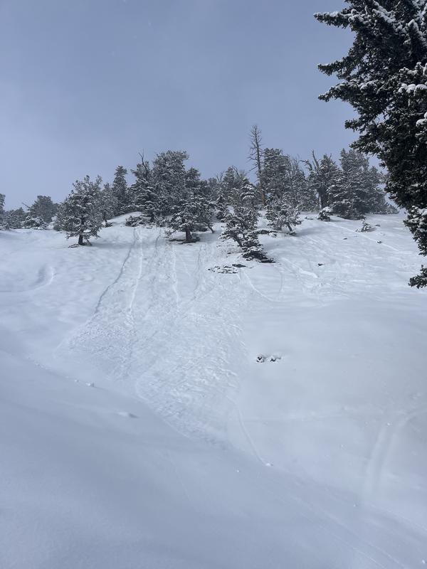We found ourselves on the west side of reeds benson ridge to start the day. The snow was rather wind effected and releasing in small pockets. As we got over the ridge the top portion of the east facing slope was wind effected, skiing down we released a few loose slufs. On the way down I noticed six loose slufs that look to have failed on the old new snow interface.