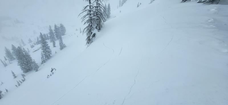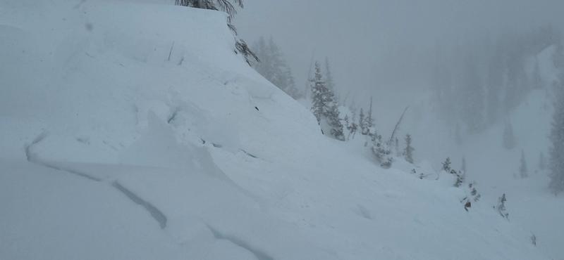 I intentionally walked on the wind slab on the ridgeline in a safe zone, saw the shooting cracks to the rollover. The avalanche released on the thinner snowpack on the buried cliff bands and the crown traveled along the ridgeline between the runs Liz's Slide and Heaven's Gate. It was hard to get good photos and I could not see the debris below, so the Rsize and Dsize are estimates. I also was unable to see how far it ran. But I did see it happen and it moved FAST.