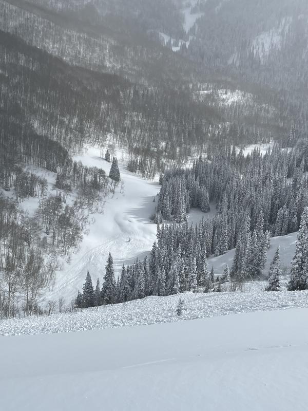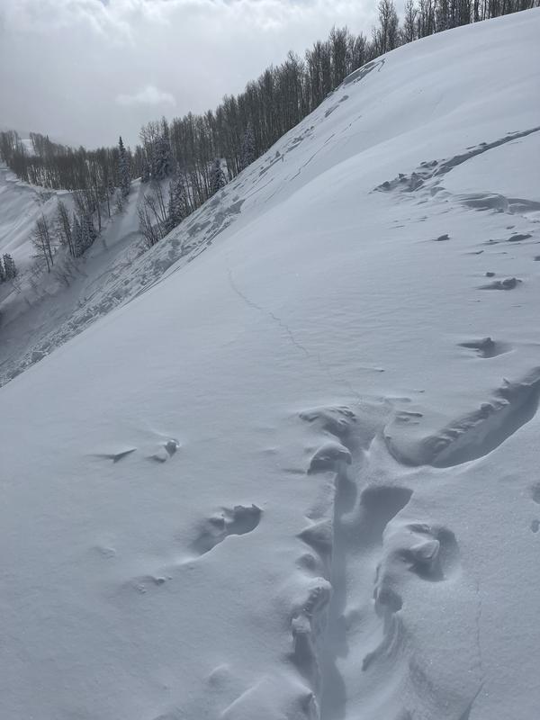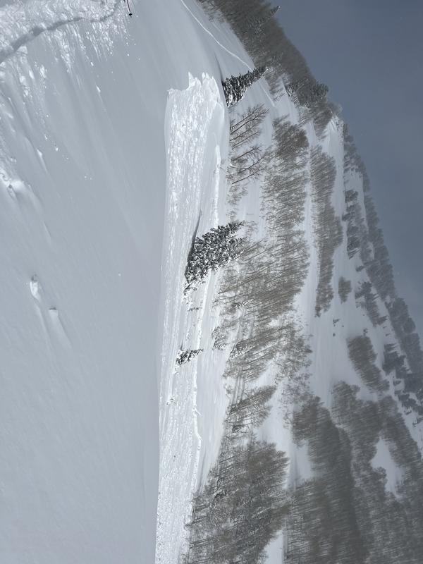 Possibly triggered from the skin track along the ridge with a crack extending to skin track. No new tracks into slide. Slide did not involve skin track.