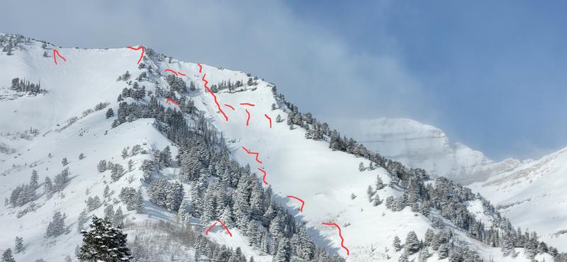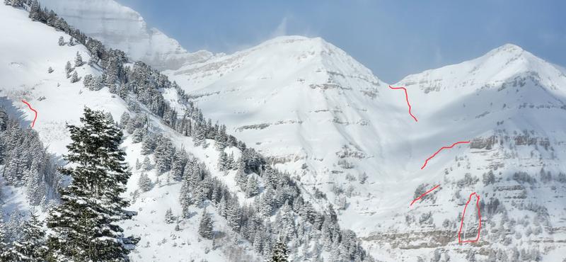 Natural avalanches all over the Timpanogos wilderness. I was having a wonderful day at Sundance, so I didn't take too many photos or analyze them too much during the brief moments of clear skies this morning. But here are some of the photos that I captured. The Fingers (photo 2) above Dry Lake were littered with point releases in the 7500-8300' elevation range. Rocky thinner snowpack zones being sensitive.