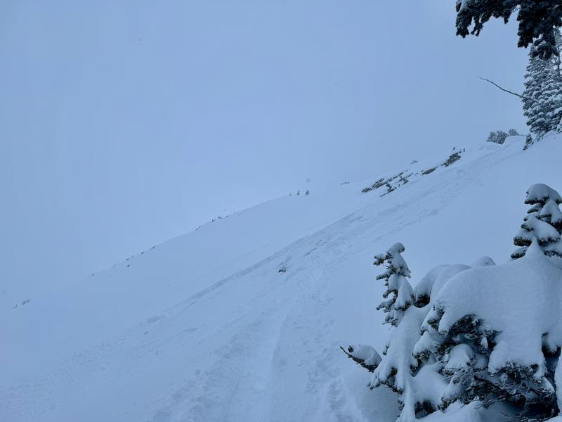 I descended and in my return uphill about 3/4 of the way back to the ridge I came across a member from the party who descended the shot that slid. The guy said someone in their group had caused the slide and got carried to the trees roughly 100 yards below (sort of in photo but light wasn't great). Sounds like the person carried was partially buried.