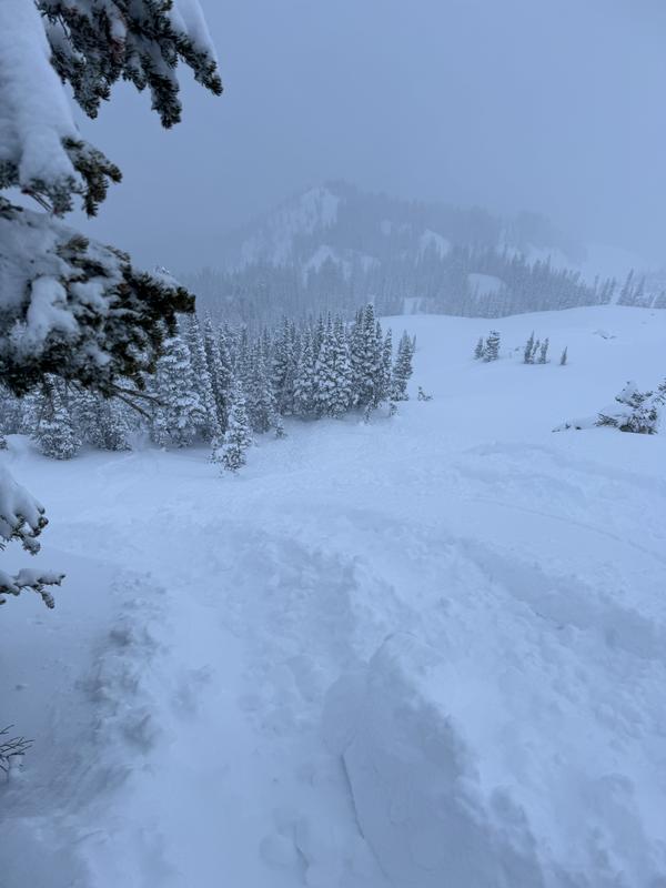 I continued up to the ridge and got to a place that felt as safe as it could be close to where the party who caused the slide had transitioned. The first turns they would've made were over a rollover that was definitely over 30 deg and also a spot that if you're familiar with Georges, sits on top of a slab of granite. The failure seemed to happen down to the rock and propagated 100-150 feet to another large boulder. I didn't catch whether the trigger happened from below or above as there were tracks going into both.