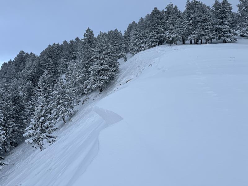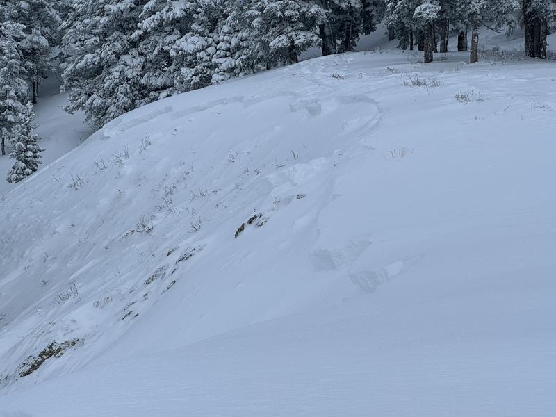 Our party was travelling up to Summit Park peak when our lead skier decided to check out known instability area. Sensing that the area could be remotely triggered he began to walk towards the bottom of a wind loaded ridgeline while still far back from any danger. We were the first in the area and breaking a new trail to the peak, so there was no danger of anyone in the runout zone. Further it is on a slope that is rarely skied or traversed underneath. The slope reacted as he thought and remotely triggered a slide 800 feet up the ridgeline from us. At the time we were 10' back from the ridgeline and still far below in the flats. Extremely sensitive. The slide was 18-24" in depth and propogated 150' wide. We did see signs that it stepped down to the ground around 20' down the slope.