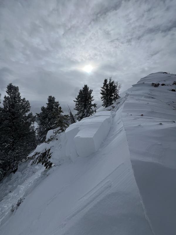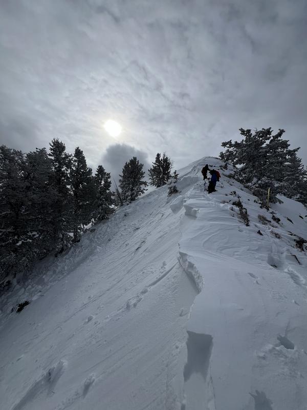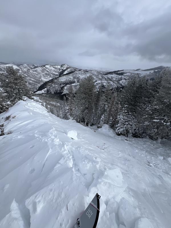 Triggered this while skinning up the north ridge. Could feel the collapse and watched the entire slope fracture to the right and left. Everyone was in a safe place when this happened. Was rather slow moving, but the debris pile was several feet deep.