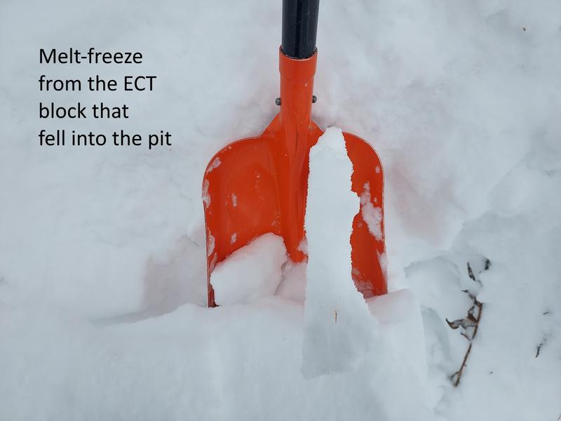 I was in some low altitude terrain today and on my way to try to push on this slope but discovered it had already naturaled. The slide was about a foot deep, 100 ft wide, ran about 80 feet and contained about half of our new snow since the high and dry running above the melt-freeze. Some old growth dead fall stopped the slide. With that information and a cross reference with the snow stakes it looks like this happened on the 10th mid-storm cycle. I performed ECTs in the corner of the flank and crown and my tests failed below the melt-freeze between 11 and 14 taps. Although the entire block collapsed only half fell into the pit both tests.