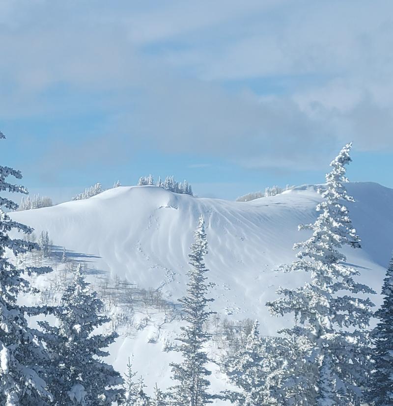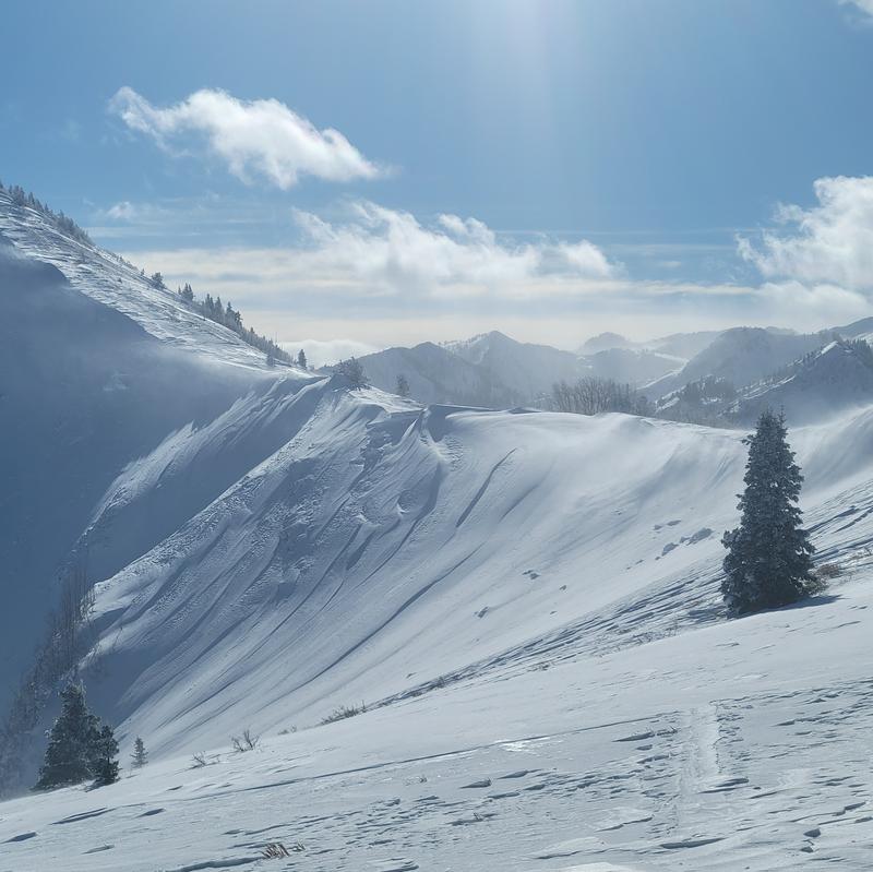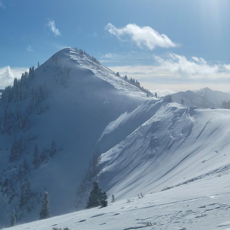 Walked up to the PC ridgeline to do some avalanche viewing. We were blessed with good visibility but the winds were quickley covering old slides. East and South monitor had numerous avalanches, pictured further below. Reynolds, Gobblers, Raymond all had large naturals. Silver spoon and meadow chutes. These were the exciting ones we saw. Lots of action on east aspects. Pictured below is the slide from radar love which has since been partially refilled by the wind. There was debris all across the bowl and lower on the lookers left you can see where the slide gorged through. In the photo you can also see airborne snow off of the ridge. This was a constant along the PC ridge throughout the day. Consistent strong winds from the west.