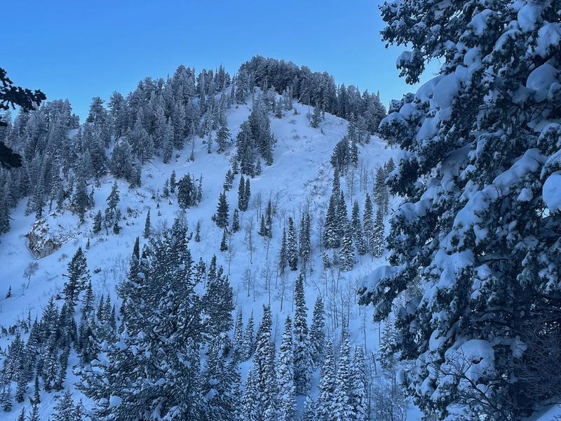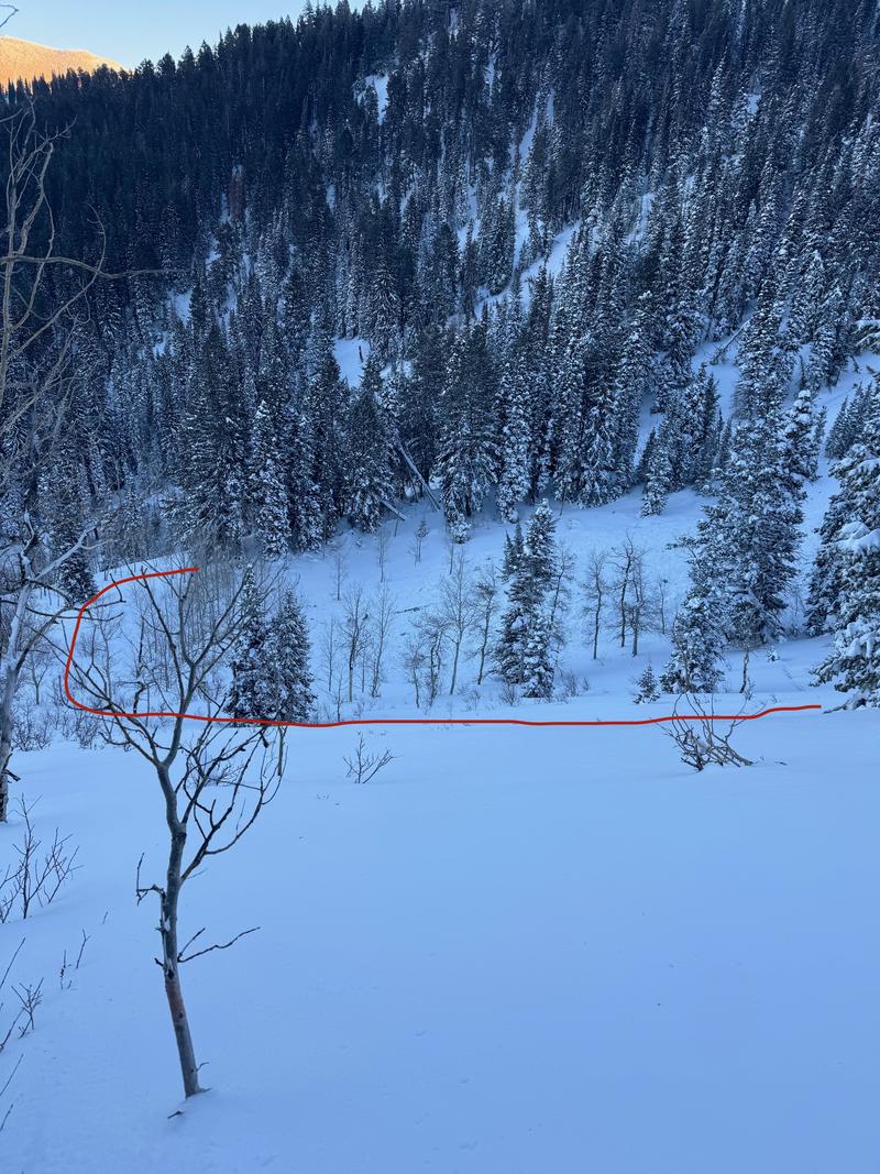 Mark and I went to look at the Thousand Springs Avalanche and on our way up the ridge to try and find the crown face we observed this avalanche in Bonus Bowl that went from the highest point in the bowl to the skiers left in the open portion of the bowl and was spotty through the trees on the skiers right side. The debris ran well to the flats and had trees in it. The avalanche looked to have failed on facets near the ground because of all the brush and summer surface was visible. The light in the photos make it hard to see the crown. The more east facing side of the bowl took more wind from the west wind event and had a deeper crown face. It was hard to get photos of this side, but it was lower in elevation than the north facing part of the starting zone. This avaalnche ran approximately 800' vertical feet from 9,000- 8,200' stopping in the flats well above the MCC road. This avalanche from Bonus Bowl did not hit the MCC road.