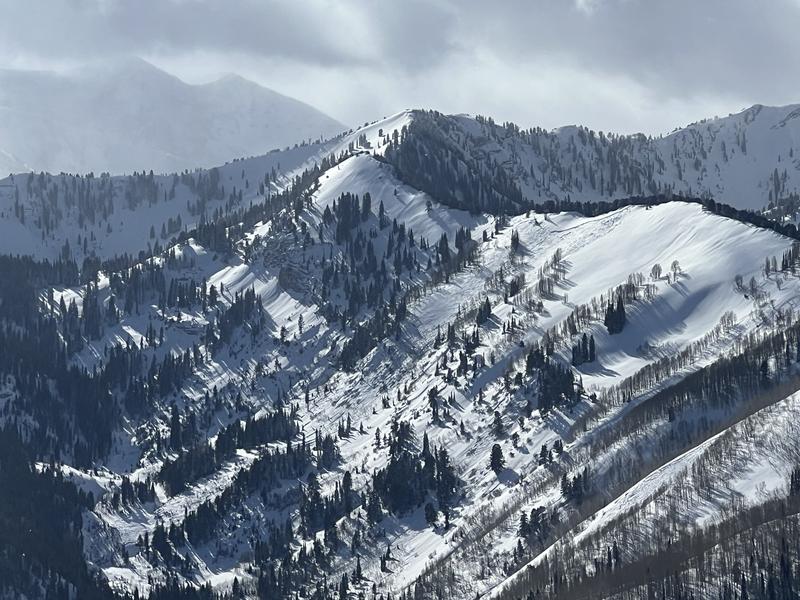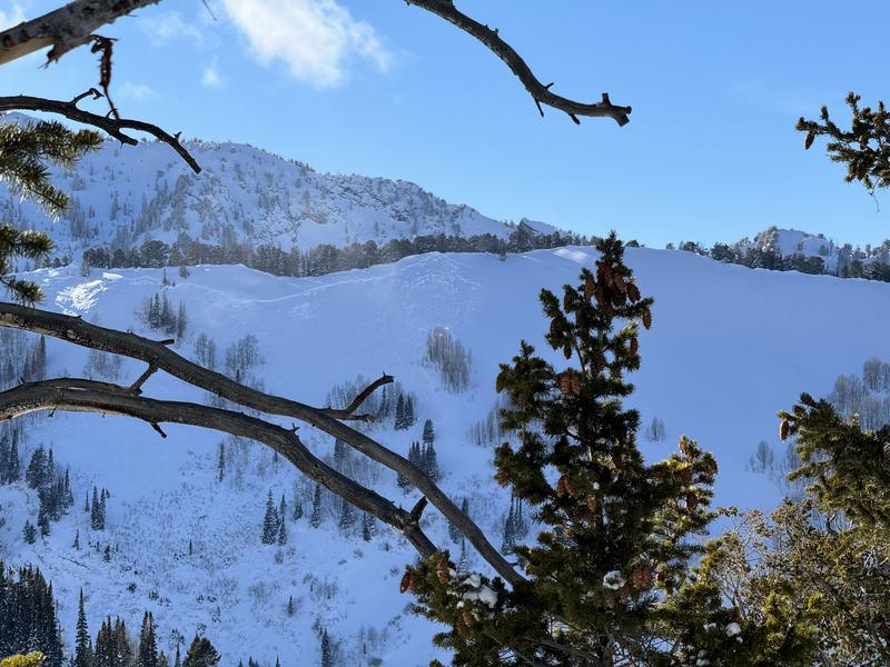 I've made a ton of guesses regarding this slide. I assume it happened somewhat recently due to the well defined crown and debris not being very smoothed by wind loading. From solitude, there didn't appear to be tracks anywhere in silver fork, so it may have naturaled. A lot of the popular areas in SF have similar aspect and slope angle, so I'd also guess it wouldn't take much to pop more loose and get filtered through the trees below